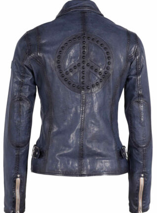 Mauritius Jacket “Maysie” (Deep Navy Blue) – this luxurious 100% genuine very soft top quality leather jacket in vintage inspired “distressed” leather design features a peace sign with studs embellishment on the back, an asymmetric front zip closure, long sleeves with adjustable zipper at cuffs, chest zip pocket, side zip pockets, adjustable buckles on the sides, exquisite fit. Fabulous style, indeed.